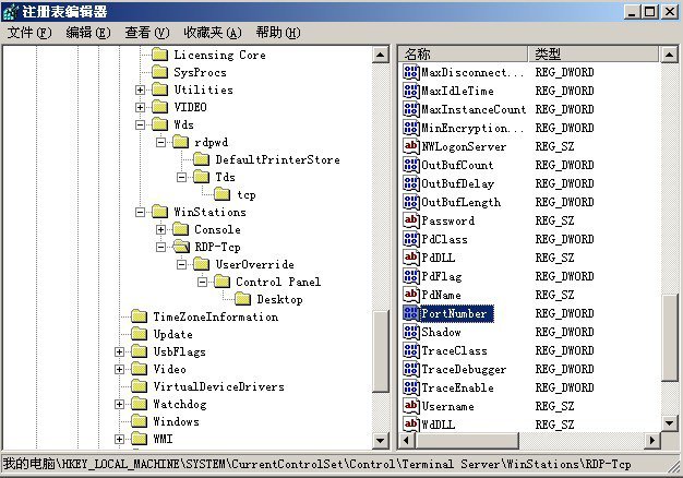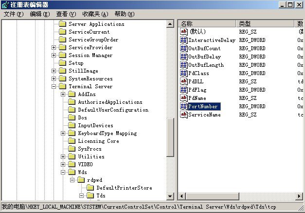 2. 在 tcp 子键所对应的右侧显示区域中,我们会看到一个名为 PortNumber 的子键,这个子键其实就是用来定义远程桌面端口号码的,将该子键的数值设置成其他端口号码,例如可以将其数值设置成 9999 (自定义)。